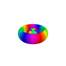 La ligne en haut de la figure ci-dessus représente des surfaces d'isodensité complètes tandis que la ligne du bas correspond à des vues écorchées, qui peuvent fournir une meilleure vue des surfaces intérieures qui sont parfois cachées. La phase de la fonction d'onde est quant à elle représentée à l'aide du code couleur figurant ci-contre. La barre d'outils vous permet enfin d'ajuster le nombre de segments utilisés pour calculer la surface le long des méridiens et des parallèles, sachant qu'un plus grand nombre de segments permet d'obtenir une surface de meilleure qualité, mais avec un taux de rafraichissement plus lent.