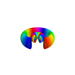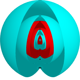 La valeur de \(\cal P\) peut être ajustée à l'aide du curseur se trouvant dans la barre d'outils. Comme le montre la figure ci-dessous, obtenue pour \(n=6, \ell=4, m=2\), les surfaces d'isodensité associées à différentes valeurs de \(\cal P\) sont l'analogue 3D des courbes de niveaux utilisées pour des représentations 2D. Les plus petites valeurs de \(\cal P\) correspondent à de plus grandes valeurs de \(|\psi_{n,\ell,m}(r,\theta,\varphi)|\).