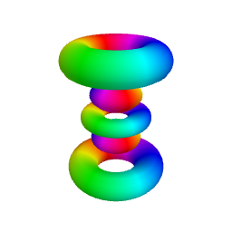 où \(Y_{\ell,m}(\theta,\varphi) = F_{\ell,m}(\theta)\exp(i m \varphi)\) est une harmonique sphérique. Sachant que \(R_{n,\ell}(r)\) comporte \((n-\ell-1)\) nœuds et que \(F_{\ell,m}(\theta)\) comporte \(\ell-|m|\) nœuds (dans l'intervalle \(]0, \pi[\)), on peut facilement reconnaître toute orbitale atomique, à condition d'ajuster correctement la valeur de \(\cal P\) de manière à visualiser tous les volumes pertinents afin de ne manquer aucun nœud de la fonction d'onde.