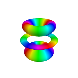The above applet provides a 3D representation of the wavefunctions \(\psi_{n,\ell,m}(r,\theta,\varphi)\) of the hydrogen atom. Using the toolbar, you can specify desired values of \(n\), \(\ell\) and \(m\). The mouse can be used to change the point of view and the zooming factor. The wavefunction is represented using isodensity surfaces, defined as surfaces where \(|\psi_{n,\ell,m}(r,\theta,\varphi)|\) takes a constant value \(\eta\), chosen so that there is a probability \(\cal P\) of finding the electron inside the enclosed volumes, where \(|\psi_{n,\ell,m}(r,\theta,\varphi)|\ge\eta\). In other words,